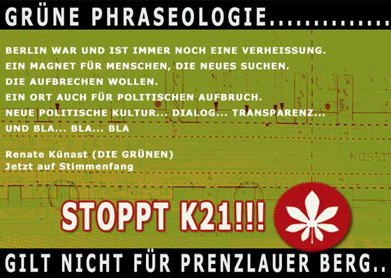 STOPPT K21 bedauert, dass die Berliner Grünen, die im Wahlkampf Berlin als einen Ort des politischen Aufbruchs beschreiben, eine neue politische Kultur, Dialog und Transparenz versprechen, sich im konkreten Fall in Lügen und Heuchelei verflüchtigen.