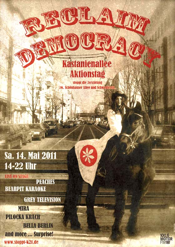 Vorbereitungen für den Aktionstag am 14. Mai laufen auf Hochtouren. Wie angekündigt, wird die K-Allee an diesem Samstag zwischen Schönhauser Allee und Schwedter Straße abgesperrt. Auf Höhe des Praters steht dann eine Bühne, auf der PEACHES, GREY TELEVISION, BELLA BERLIN, MIRA, BEARPIT KARAOKE und viele andere Acts für die Kastanienallee spielen werden. Der Aktionstag wird ein erster Höhepunkt des Protests gegen die Zerstörung der Kastanienallee, die in diesem Jahr ihr 185-jähriges Bestehen feiert.